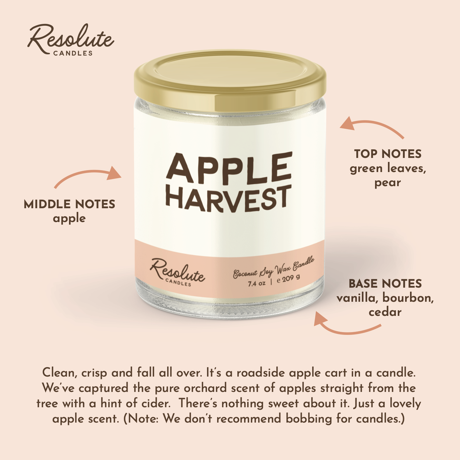Clean, crisp and fall all over. It’s a roadside apple cart in a candle. We’ve captured the pure orchard scent of apples straight from the tree with a hint of cider. There’s nothing sweet about it. Just a lovely apple scent. (Note: We don’t recommend bobbing for candles.)
